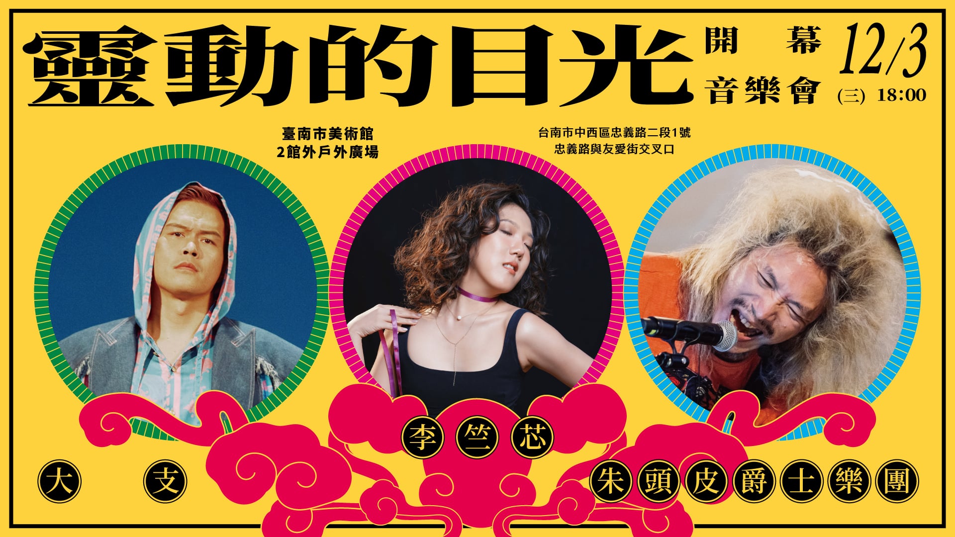 「靈動的目光」是一場由百人跨界參與、跨世代共創的藝術行動。製作團隊歷時多月,深入臺南各大廟宇與巷弄,踏查這座城市的文化肌理,從傳統宮廟工藝、族群聲響,到當代音樂與影像語彙,探索「觀看臺南」的無數種方式。這場展演是「最臺南」的創作陣容,由光雕藝術家陳怡潔擔任藝術總監、音樂總監王希文統籌音樂創作,集結饒舌教父大支、金曲客語歌手米莎、音樂藝術家李竺芯,以及搖滾頑童朱頭皮與歌手史茵茵共同參與。