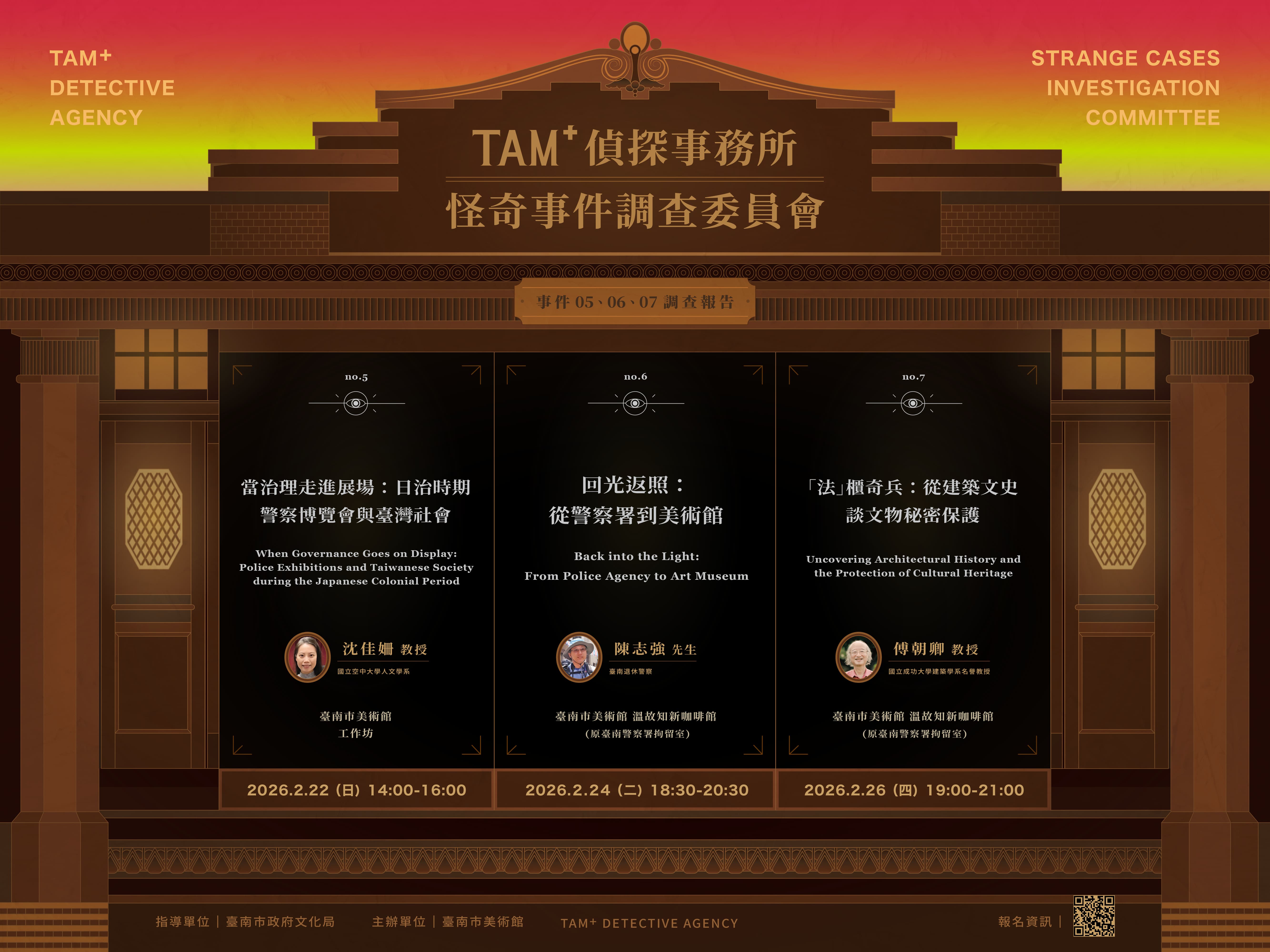 事件05「當治理走進展場:日治時期警察博覽會與臺灣社會」由沈佳姍教授主持,解析1920年代警察衛生事務展覽會,呈現警察在社會治理中的角色;事件06「回光返照:從警察署到美術館」邀請攝影家與退休警官陳志強,以影像與經驗回顧警察署在日本統治、二二八事件及白色恐怖期間的重要歷史;事件07「『法』櫃奇兵:從建築文史談文物秘密保護」則由傅朝卿名譽教授引導參觀者追溯龍王廟歷史,並介紹文物保存故事。透過三場活動,民眾可互動理解臺南土地的歷史軌跡與美術館承載的多重故事。
