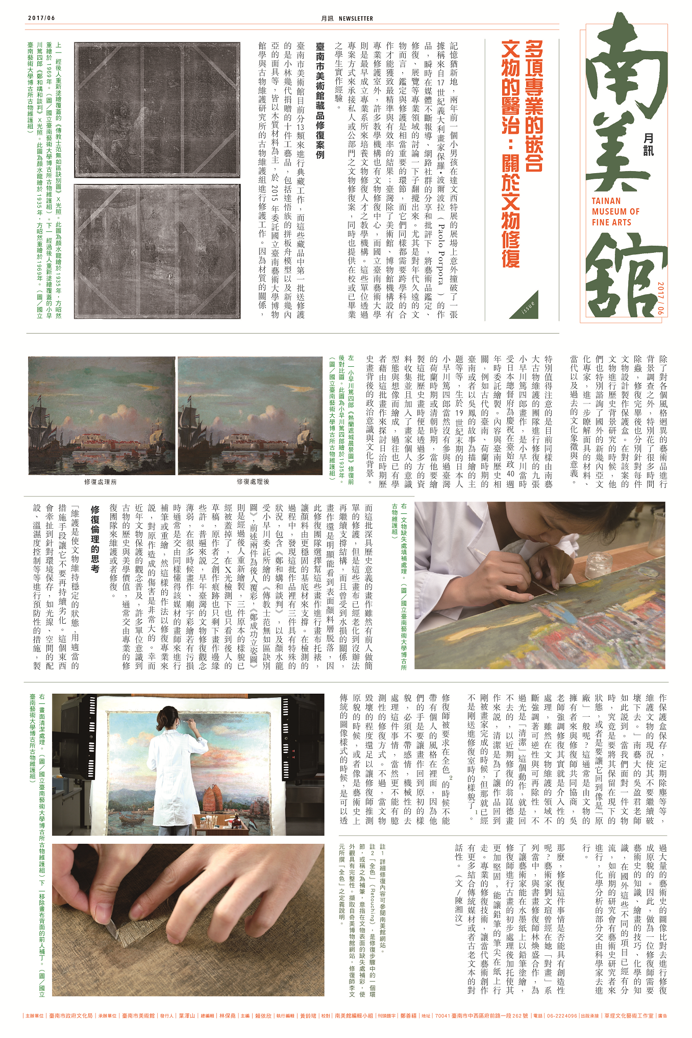 記憶猶新地,兩年前一個小男孩在達文西特展的展場上意外撞破了一張據稱來自17世紀義大利畫家保羅・波爾波拉(Paolo Porpora)的作品,瞬時在媒體不斷報導、網路社群的分享和批評下,將藝術品鑑定、修復、展覽等專業領域的討論一下子翻攪出來。尤其是對年代久遠的文物而言,鑑定與修護是相當重要的環節,而它們同樣都需要跨學科的合作才能獲致最精準與有效率的結果;臺灣除了美術館、博物館機構設有專業修護室外,許多教學機構也有文物修復中心,而國立臺南藝術大學則是最早成立專業系所來培養文物修復人才之教學機構。這些單位透過專案方式來承接私人或公部門之文物修復案,同時也提供在校或已畢業之學生實作經驗。