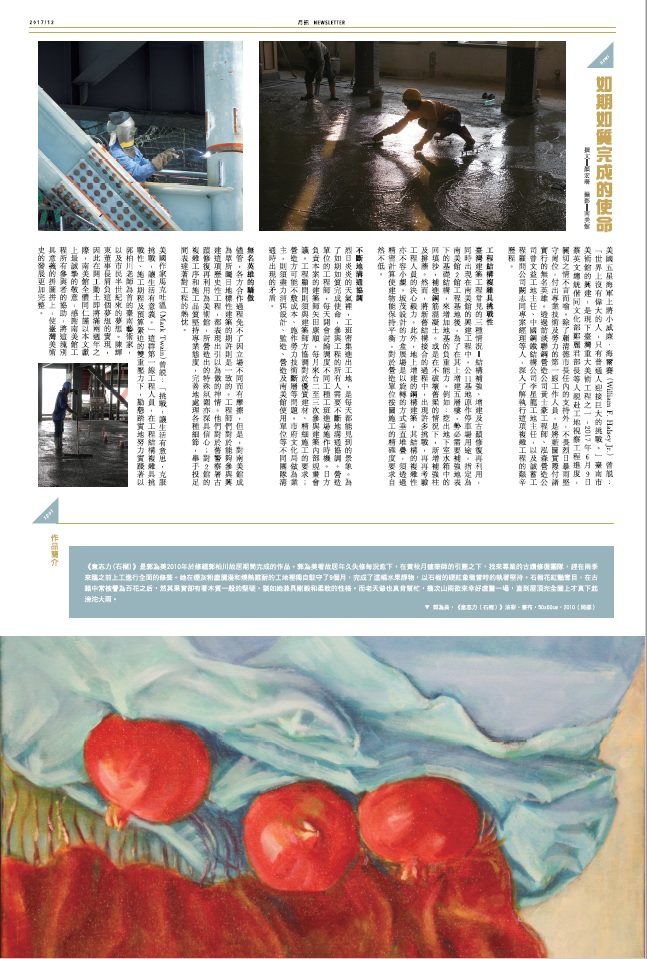 美國作家馬克吐溫(Mark Twain)曾說:「挑戰,讓生活有意思,克服挑戰,讓生活有意義。」這群第一線工程人員,在工程結構複雜具挑戰性、施工期程及預算緊迫的雙重壓力下,勤懇踏實地努力實踐著,以郭柏川老師為首的臺南藝術家,以及市民半世紀來的夢想。陳輝東董事長肩負這個夢想的實現,因此在開工動土即將滿兩週年之際,南美館全體同仁僅以本文獻上最誠摯的敬意,感謝南美館工程所有參與者的協助,將這塊別具意義的拼圖拼上,使臺灣美術史的發展更加完整。
